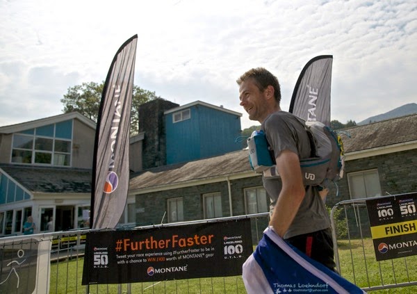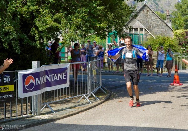 The run towards Tiberthwaite was warm, very warm but by now it was starting to dawn on me that unless something disastrous happened I would win. I couldn't quite believe it and got a little emotional as I dragged myself towards the end. I was still emotional when I reached Tiberthwaite and it didn't make it any easier when they had specially made me pasta as they had heard I’d been asking for it for the last few checkpoints. Oh and it was so good - I honestly can say it was the best pasta I had ever tasted and then when I asked for energy drink they said that they had none but 2 minutes later one of the crew appeared with her own energy drink and filled my bottle. Thank you so much to everyone at Tiberthwaite - I don’t know any of your names but as I left the Checkpoint I felt so much better but still pretty emotional. Half way between Tiberthwaite and the end I met a man that had been following the race online. I stopped and chatted to him for ages. Much longer than I should have but it just felt right. Every now and then I would scan the route behind just to be 100% sure that none was coming. Then just one more downhill and my God it hurt my knee so much. I was in agony but when I reached the road it started to feel better as the adrenaline hit me with the finish so near. The run through Coniston was amazing. People were cheering and I ran along the middle of the road. Cars stopped for me (in my haze I probably gave them no choice but at the time I thought they had stopped for me). Debbie had told me this was amazing and she wasn't wrong. Then I saw my friend Karen with a Scottish flag which I grabbed for the end and as I ran the final few meters I couldn't believe that all these people were cheering me on and then that was it. All that planning and months of preparation and training finished too. Its a strange feeling to finish a race - you are so relieved but sad at the same time.